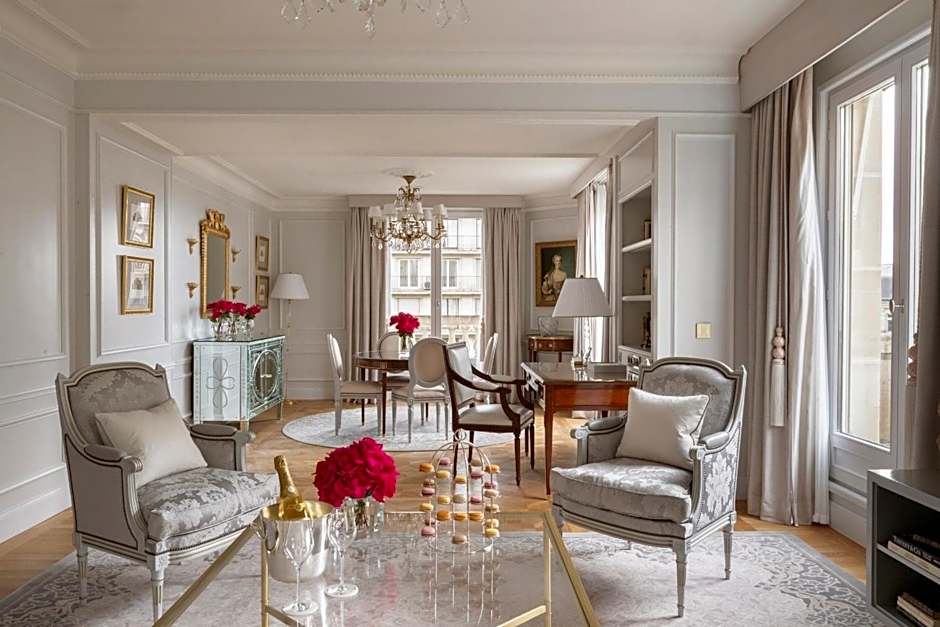 Gracious suites, with an entrance foyer leading to the large sitting room and the bedroom discreetly secluded by sliding doors. Features sparkling chandeliers and a generous seating area outfitted with elegant period furniture, a large work desk and all the modern amenities.